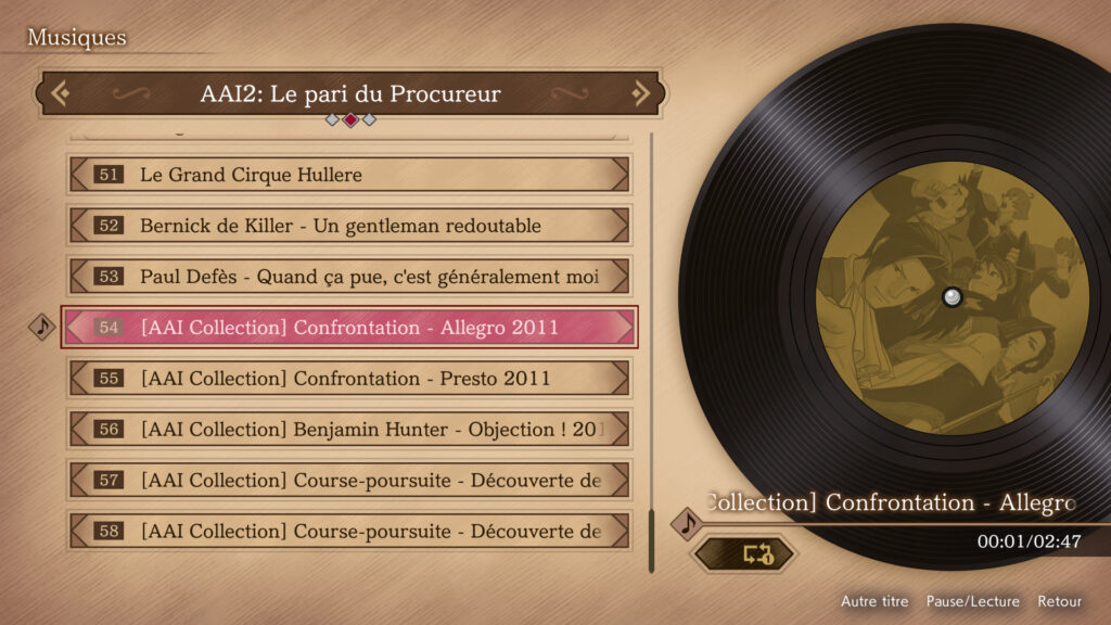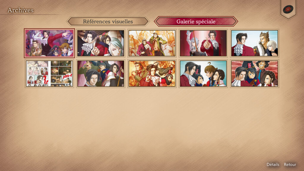 - Mode Galerie : un catalogue complet d’illustrations, d’animation de personnages, de croquis, de pubs, de synopsis et la bande originale, comprenant 106 pistes audio du jeu ainsi que 23 pistes orchestrales, une création originale et cinq morceaux arrangés du CD original Ace Attorney Investigation.
