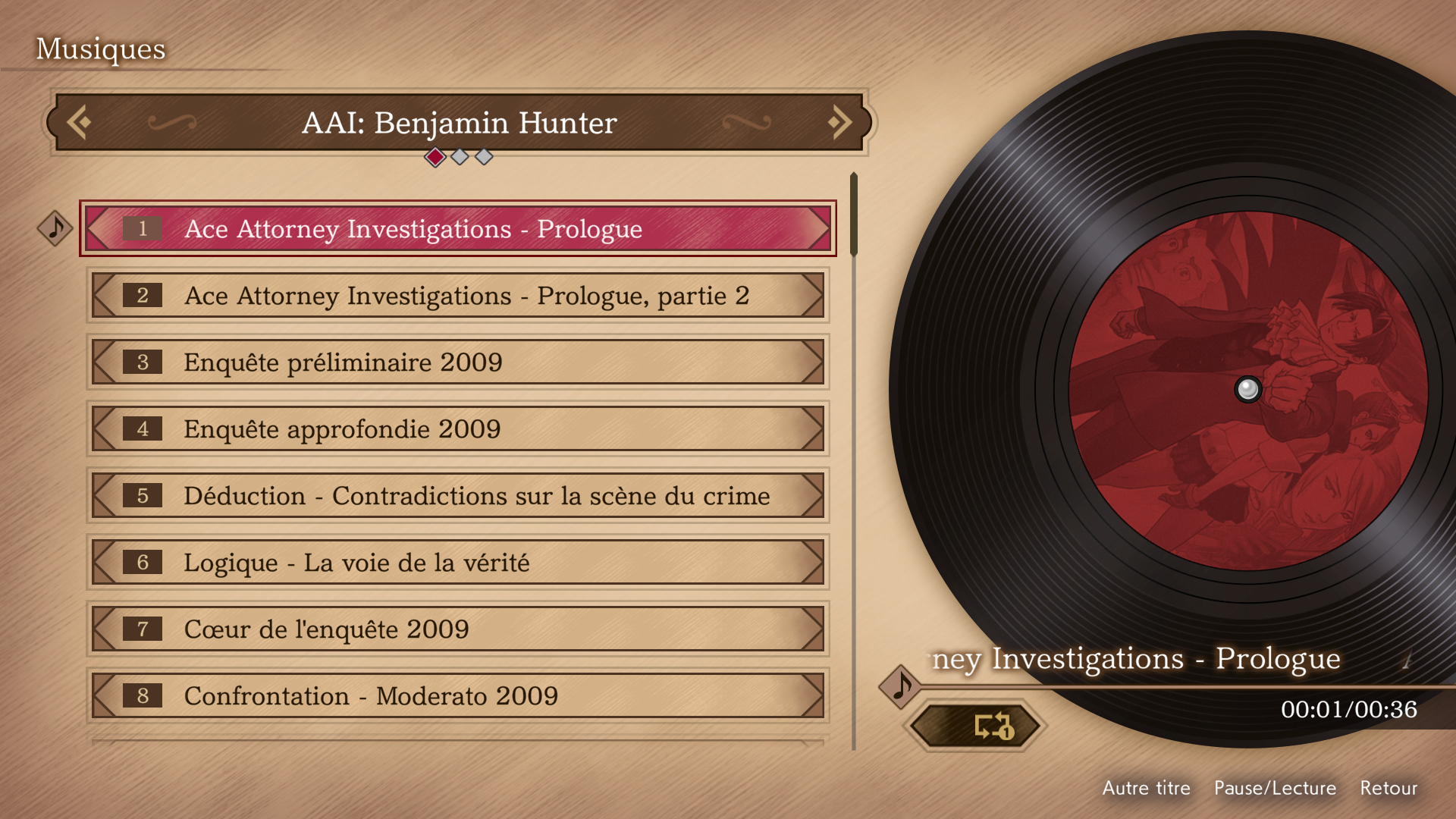 - Mode Galerie : un catalogue complet d’illustrations, d’animation de personnages, de croquis, de pubs, de synopsis et la bande originale, comprenant 106 pistes audio du jeu ainsi que 23 pistes orchestrales, une création originale et cinq morceaux arrangés du CD original Ace Attorney Investigations : Benjamin Hunter.