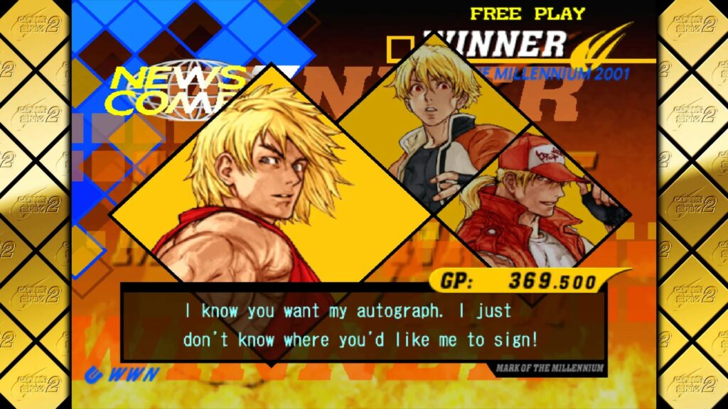 - Capcom vs. SNK 2: Mark of the Millennium 2001 : Capcom et SNK s’unissent pour un nouvel affrontement du millénaire ! Le titre propose 6 systèmes différents pour élaborer ses propre stratégies de combat en attribuant un ratio (force) aux membres de son équipe grâce au système Free Ratio !