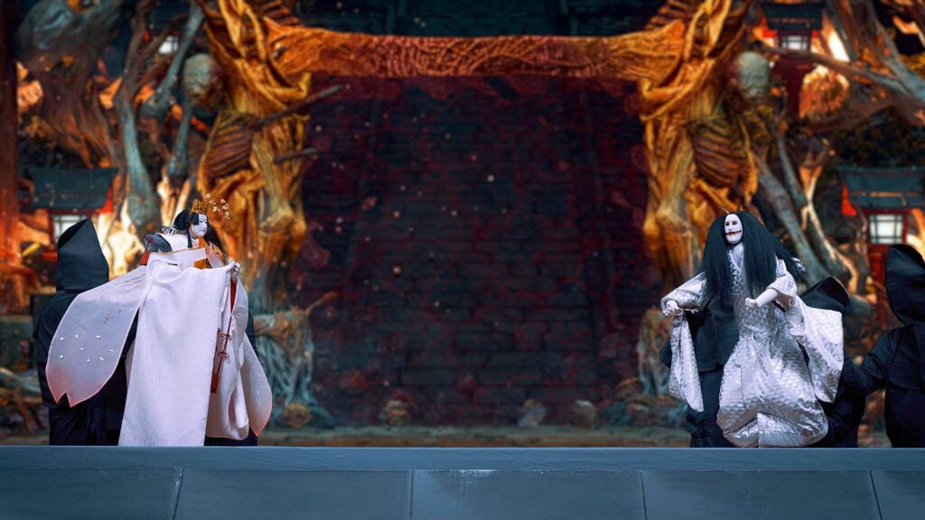 Des marionnettes spéciales ont été créées pour représenter Soh et la miko, les deux protagonistes principaux de Kunitsu-Gami: Path of the Goddess, en utilisant les techniques traditionnelles des artistes du Bunraku. Elles évoluent dans les décors du jeu projetés en arrière-plan pour un mélange surprenant de tradition et d’innovation. Une occasion unique de découvrir cette transposition du jeu prendre vie sous les doigts experts de KIRITAKE Kanjuro.