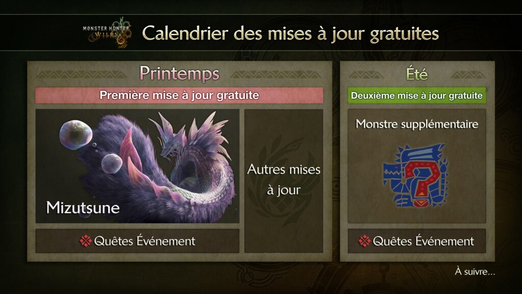 Après sa sortie très attendue d’aujourd’hui, Monster Hunter Wilds continuera d’évoluer grâce à des mises à jour de contenu post lancement. Des quêtes événement seront introduites dès la semaine prochaine, avec des armures spéciales que vous pourrez gagner en récompense. La première grande mise à jour gratuite est prévue pour le printemps 2025 et verra le retour d’un des monstres préférés des fans, le Mizutsune, le Léviathan dansant et élégant qui emprisonne ses proies avec des bulles immobilisantes. Des détails supplémentaires sur les quêtes temporaires et les autres contenus passionnants de la mise à jour gratuite 1 seront bientôt dévoilés. Les détails des futures mises à jour gratuites, dont la mise à jour 2 de cet été, seront partagés dans un avenir proche.