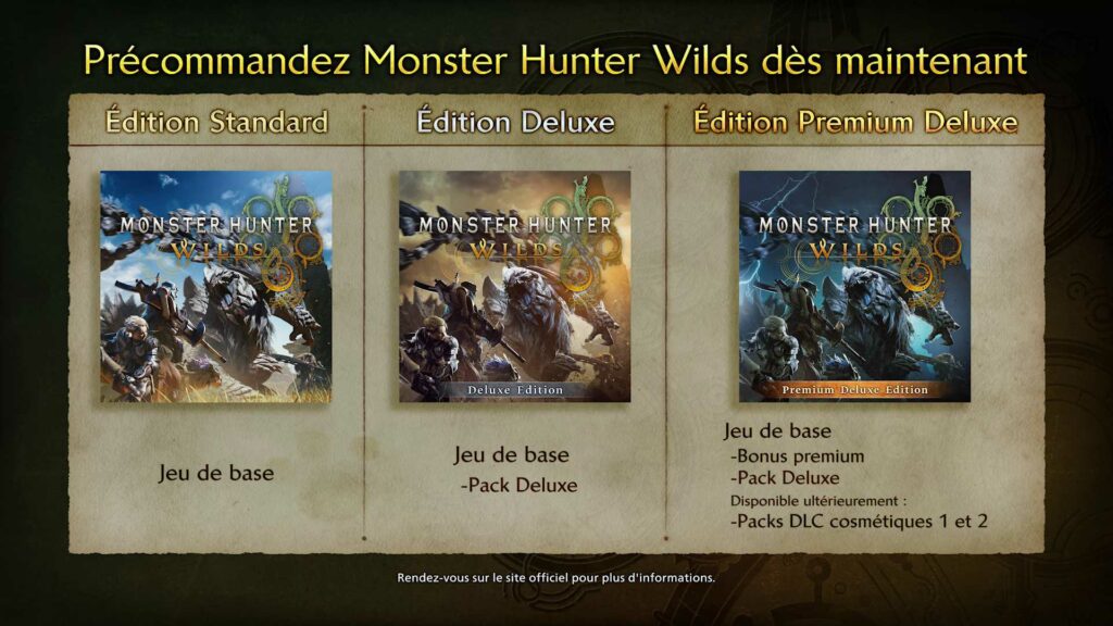 Monster Hunter Wilds est disponible (éditions physiques et dématérialisée) sur PlayStation 5 avec le support PS5 Pro Enhanced, Xbox Series X|S et PC via Steam en version Standard, Deluxe et Premium Deluxe. L’édition Deluxe comprend le jeu de base Monster Hunter Wilds et le Pack Deluxe, qui inclut une variété de DLC cosmétiques, tels qu’une Armure Spéciale pour le chasseur et des sets d’autocollants. L’édition Premium Deluxe comprend le jeu de base Monster Hunter Wilds, le Pack Deluxe, un Bonus Premium disponible dès maintenant, un DLC Pack de cosmétiques 1 à venir au printemps 2025 et un DLC Pack de cosmétiques 2 prévu pour l’été 2025.