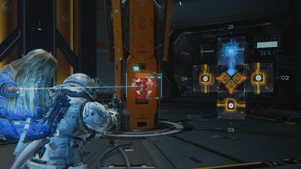 Dans PRAGMATA, le hacking et le tir sont au cœur du gameplay. Pendant le combat, un panneau apparaît à l’écran lorsque l’on vise les ennemis. Il représente la capacité de Diana à pirater les défenses de ses adversaires. En déplaçant le curseur sur ce panneau, elle peut détruire l’armure de l’ennemi et créer des ouvertures permettant à Hugh de faire exploser les points faibles de l’ennemi avec son arsenal d’armes. Ce système mettra les joueurs au défi de surmonter des situations à multiples facettes dans le feu de l’action.