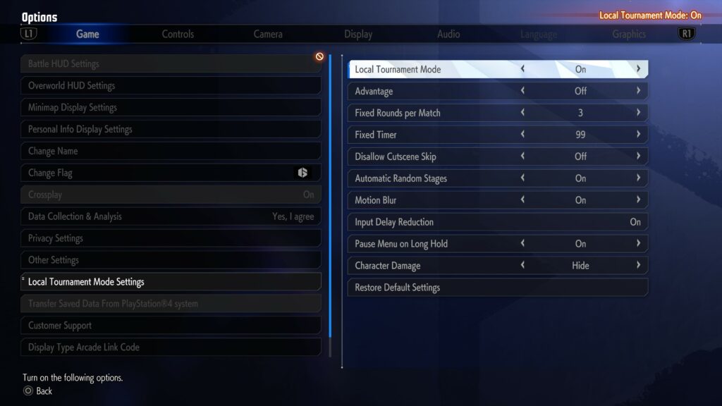 - Nouveaux paramètres du mode Tournoi local, comme la possibilité de configurer l’écran d’intro/outro pour qu’il ne soit pas interrompus, les étapes aléatoires automatiques, la mise en pause du menu en cas d’attente prolongée et bien plus encore !