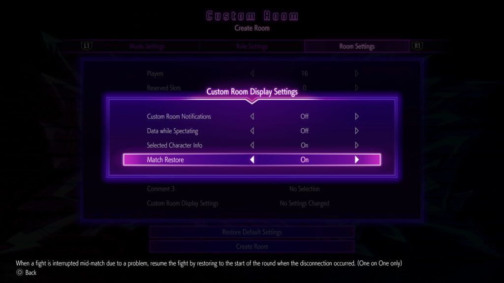 - Restauration du match ajoutée aux salles personnalisées de sorte que lorsqu’un combat est interrompu en cours de match, vous pouvez reprendre le combat en recommençant au début du round où la déconnexion s’est produite.
