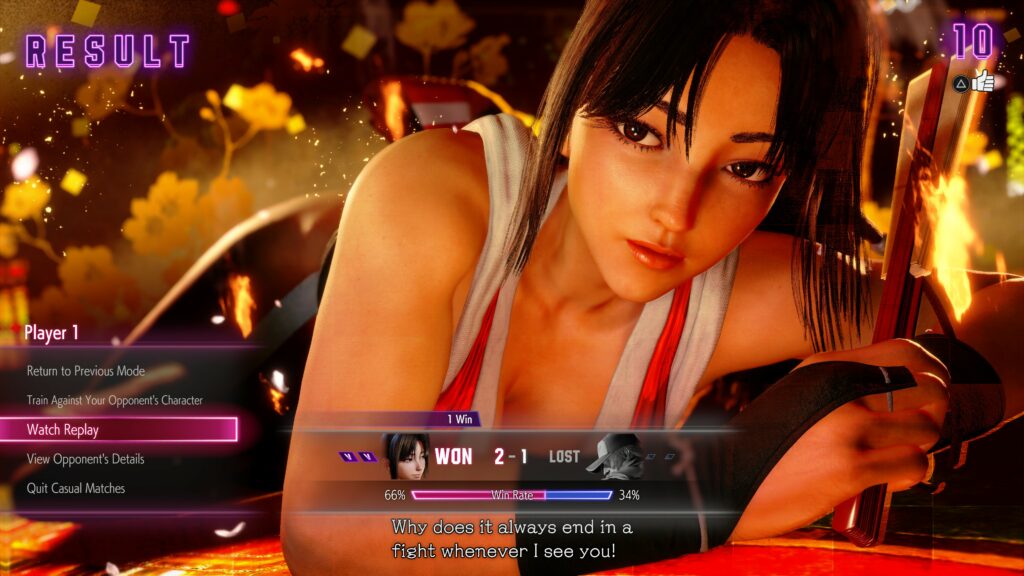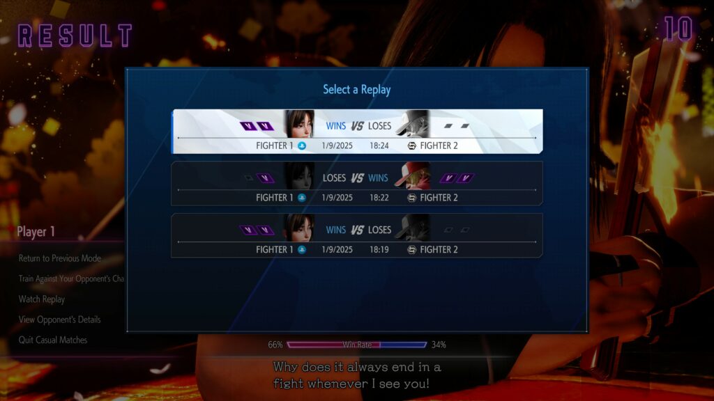 - Nouvelles fonctionnalités de replay, comme la possibilité de regarder les rediffusions à partir de l’écran de résultat de match le plus récent dans les matchs classés ou amicaux, la possibilité de mettre en pause et d’utiliser le menu même pendant les appels de rounds ou après un KO, et plus encore.