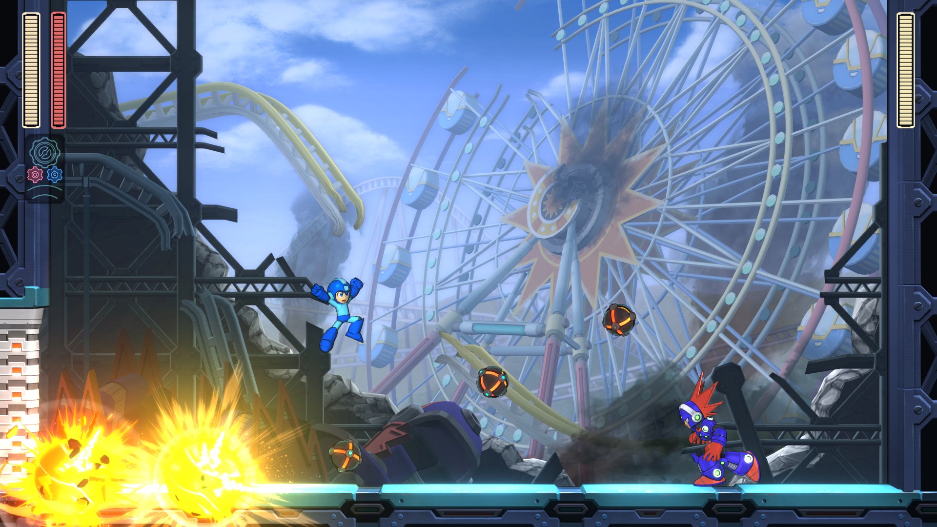 Il est évidemment toujours possible d’absorber leurs pouvoirs après les avoir vaincu afin de les utiliser dans les niveaux suivants. Il est désormais plus simple de changer d’arme grâce à un système de menu radial. Le système Double Gear de MEGA MAN 11 propose quant-à-lui de nombreuses possibilités inédites d’améliorer la vitesse et la puissance du personnage à la volée.