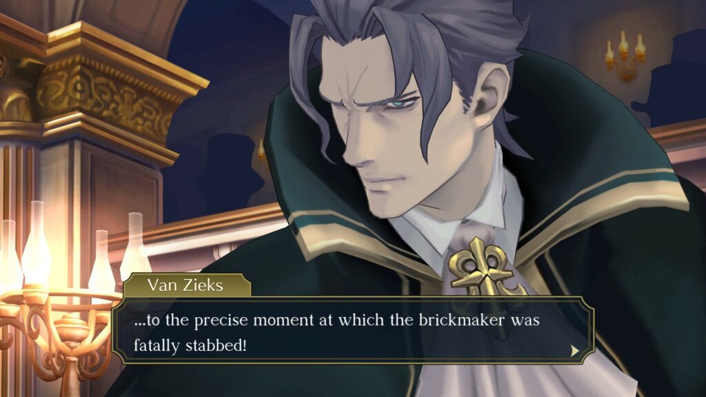 Le sort des accusés repose entre les mains de Ryunosuke pendant les affrontements verbaux de la salle d’audience. Dans ce lieu où tout se joue, les enquêteurs amateurs devront présenter des preuves, interroger les témoins clés et défendre la cause de leurs clients pour obtenir leurs relaxes et laver leur honneur. Ici, se déroulera la « Summation Examination« , phase dans laquelle vous devrez pointer les incohérences entre les déclarations des jurés afin de faire pencher la balance en leur faveur.